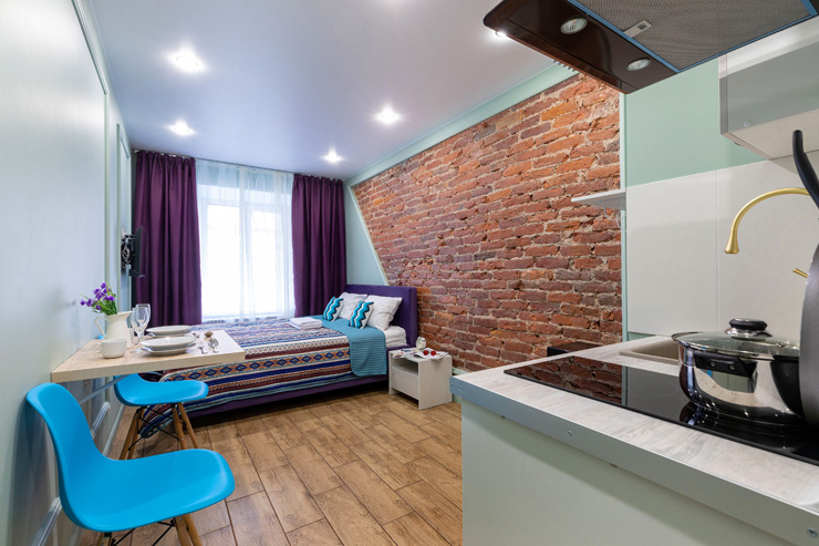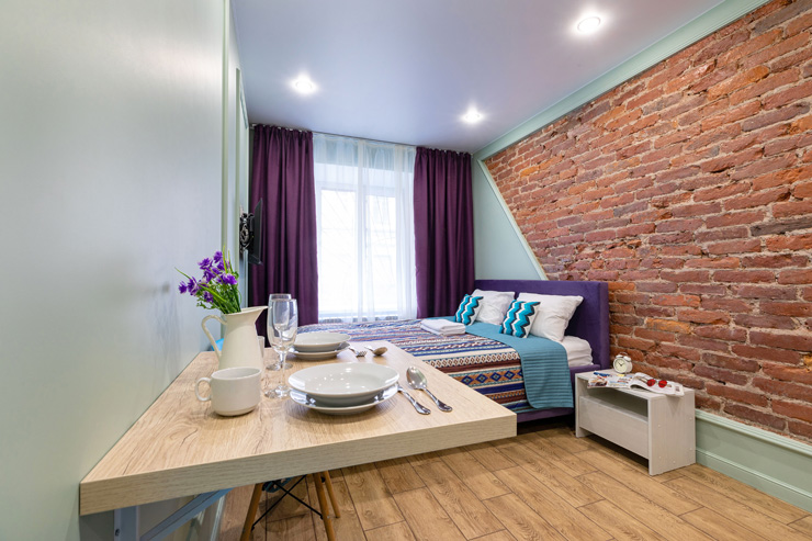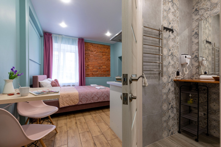 | Студия 2-местная (№1) | 16 кв.м. | 2 чел. | Мебель (вешалка, зеркало, кровать двуспальная, стол, стулья, шкаф), Мини-кухня, Оборудование (микров... | |