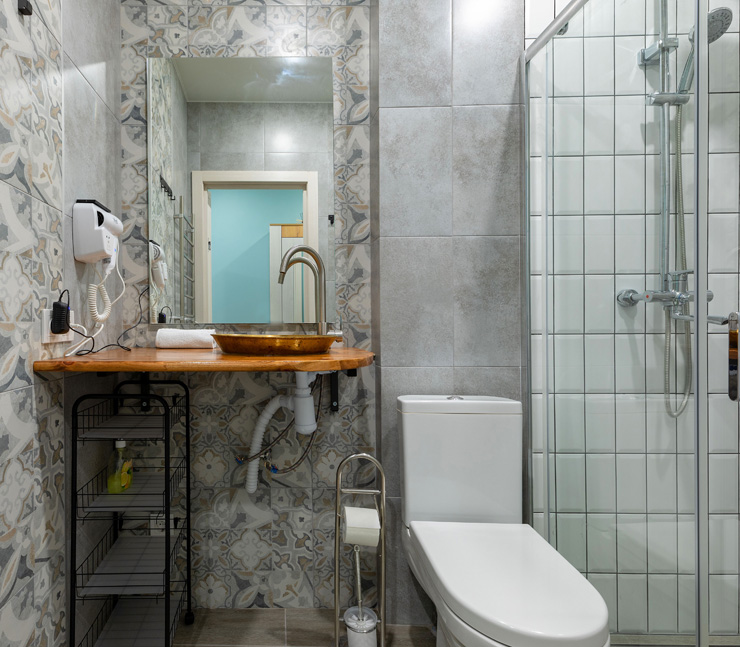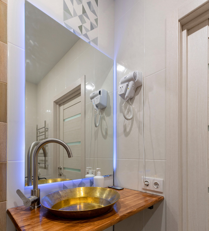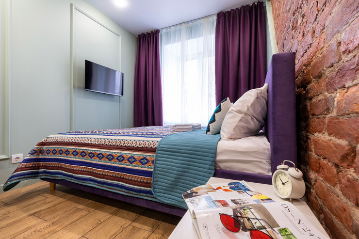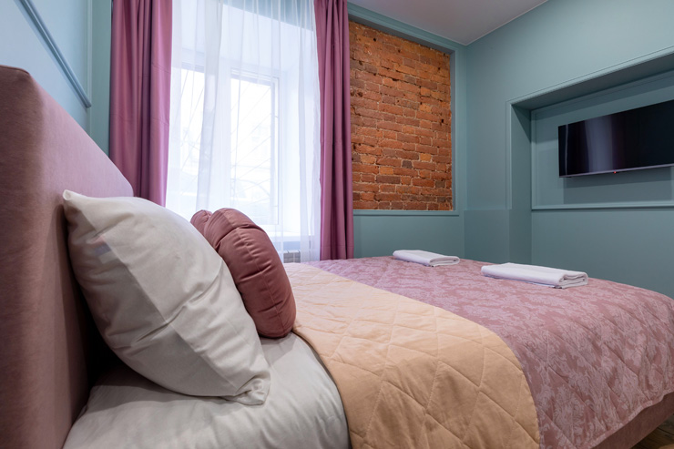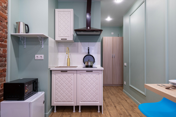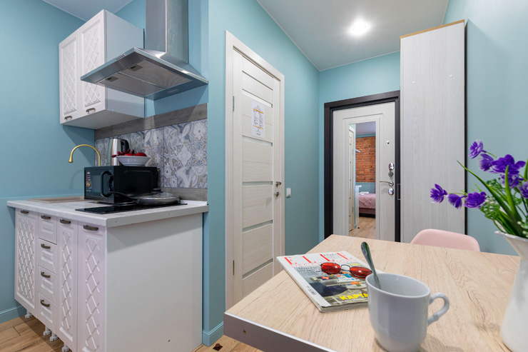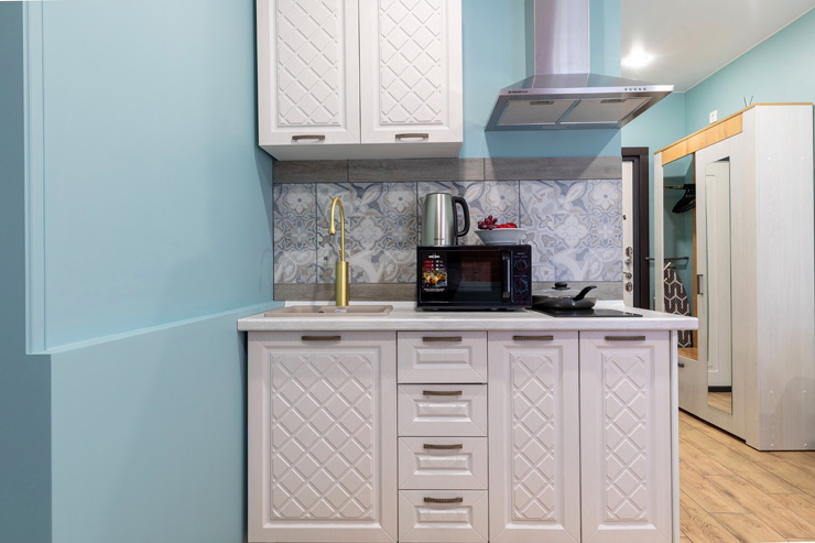 - Оборудование: микроволновая печь, мини-холодильник, набор посуды, плита электрическая, стиральная машина, телевизор, утюг, электрочайник